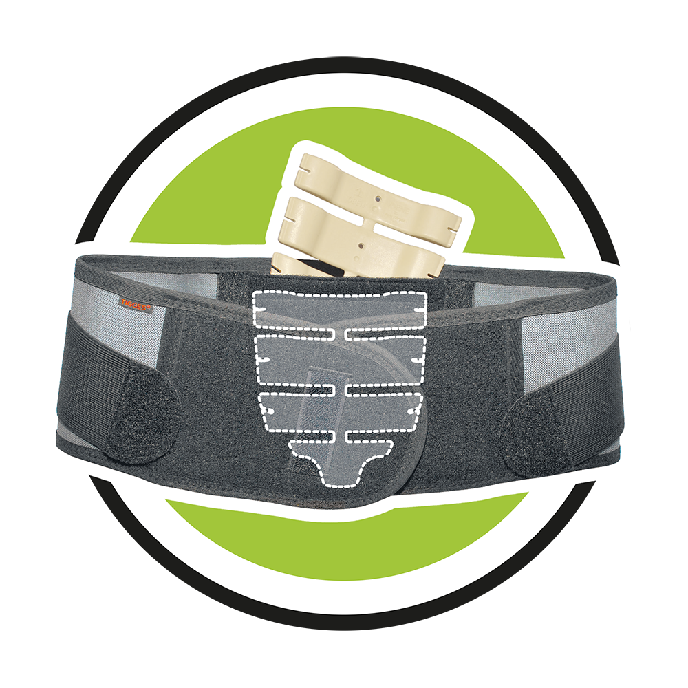 Zwei ergonomisch geformte Reklinationsbügel sorgen für die Aufrichtung der BWS. Sie verteilen den notwendigen Druck und gewährleisten so einen hohen Tragekomfort während der gesamten Anwendungsdauer. Diese Elemente werden in ein kompressionsstarkes Mieder eingearbeitet.