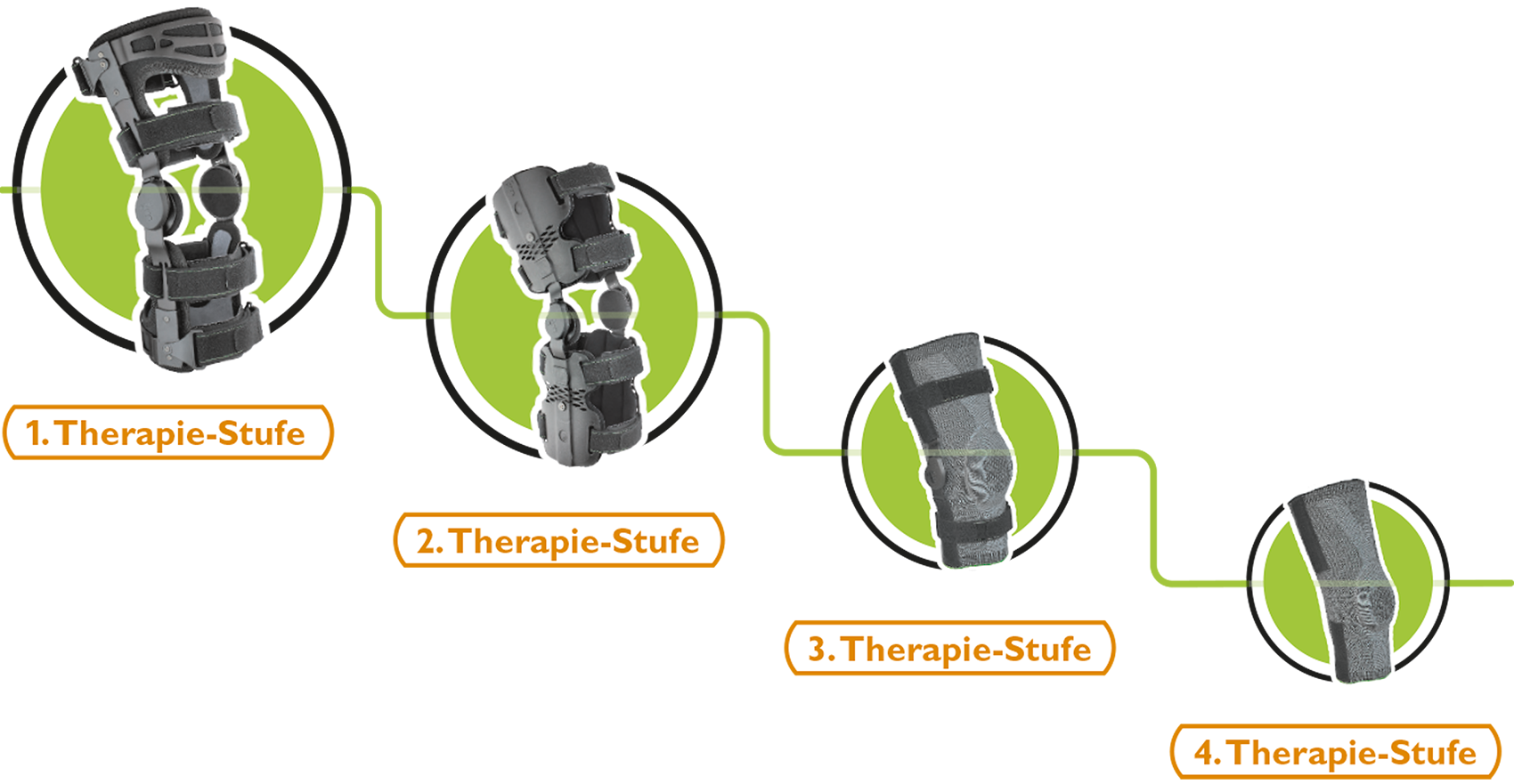 In der zweiten Therapiestufe wird der Patient mit einer Knieführungsorthese mit 4-Punkt-Prinzip und ggf. Extensions-/Flexionsbegrenzung versorgt. Diese Stufe wird durch das Austauschen der Orthesen-Spangen gegen seitlich sitzende Orthesenschalen erreicht, die sich an die Beinanatomie anpassen. Unelastische Gurte bewirken im Zusammenspiel mit den weiterverwendeten, seitlich eingesetzten Gelenkschienen eine zweidimensionale Führung des Kniegelenks und eine Entlastung und Schutz des Bandapparates.